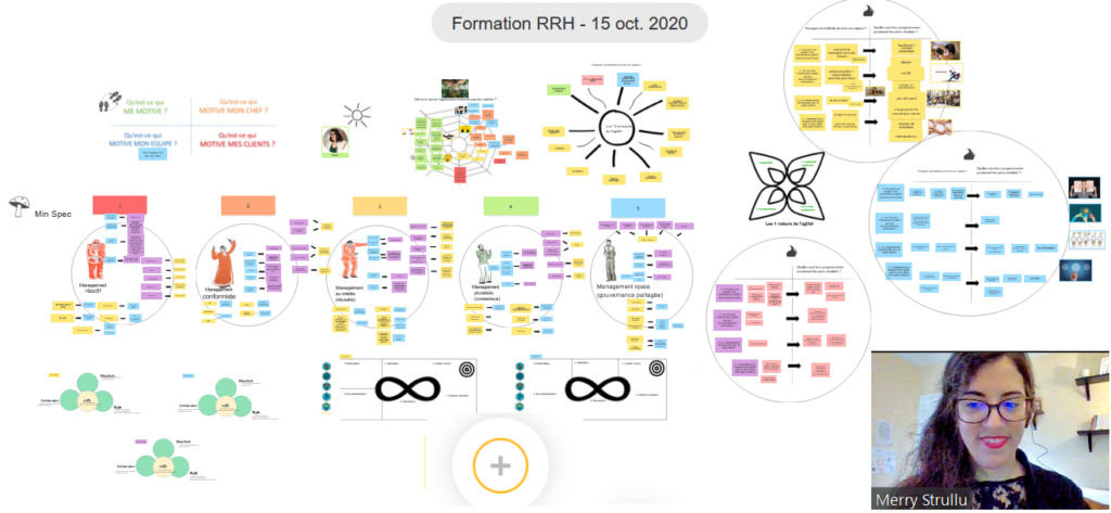 - En sous-groupe, ils partagent sur leurs apports individuels avec une personne chargée d’écriture et/ou dessiner tous ces échanges via un mur virtuel pour conserver une trace qui pourra leur servir pour la suite (phase d’émergence) ;